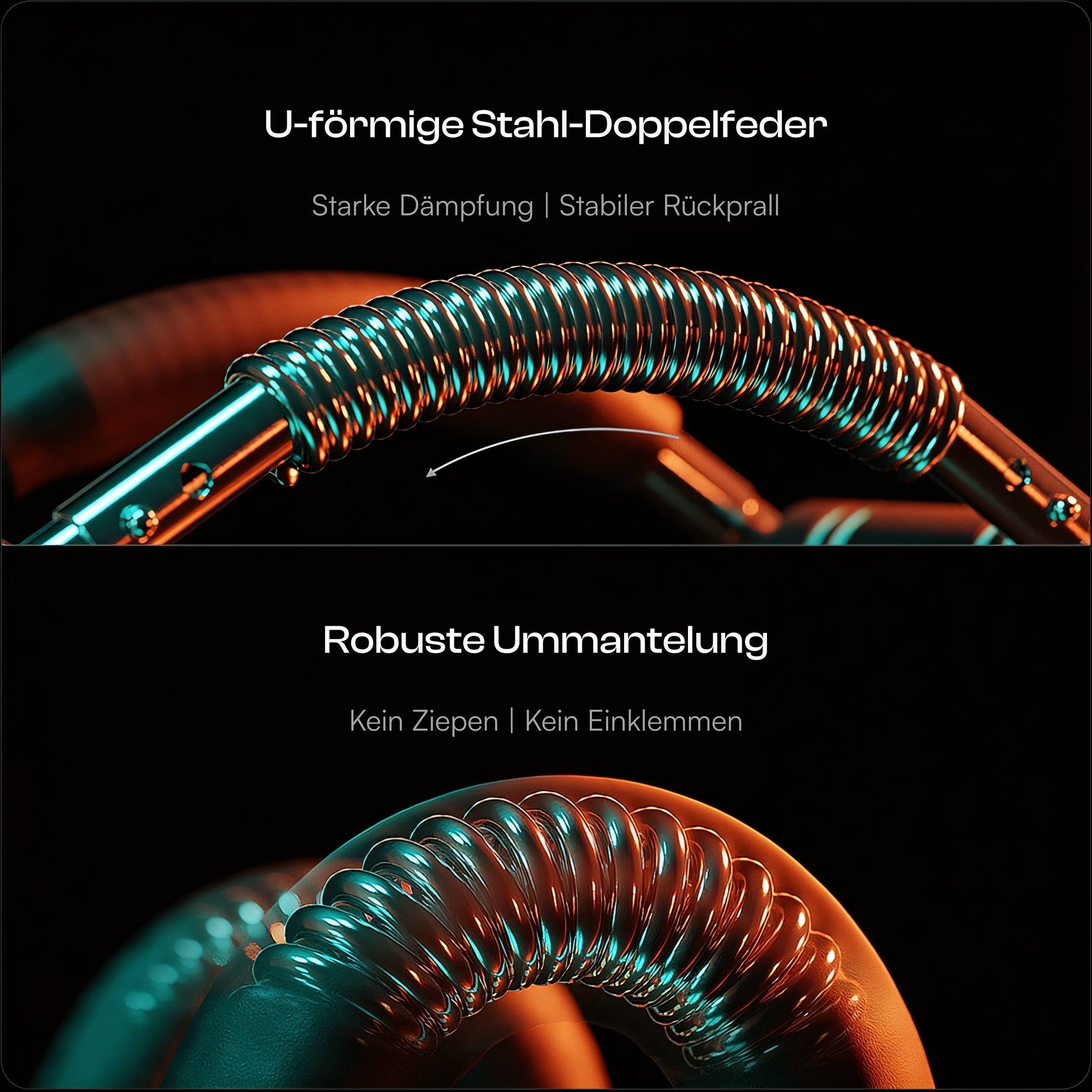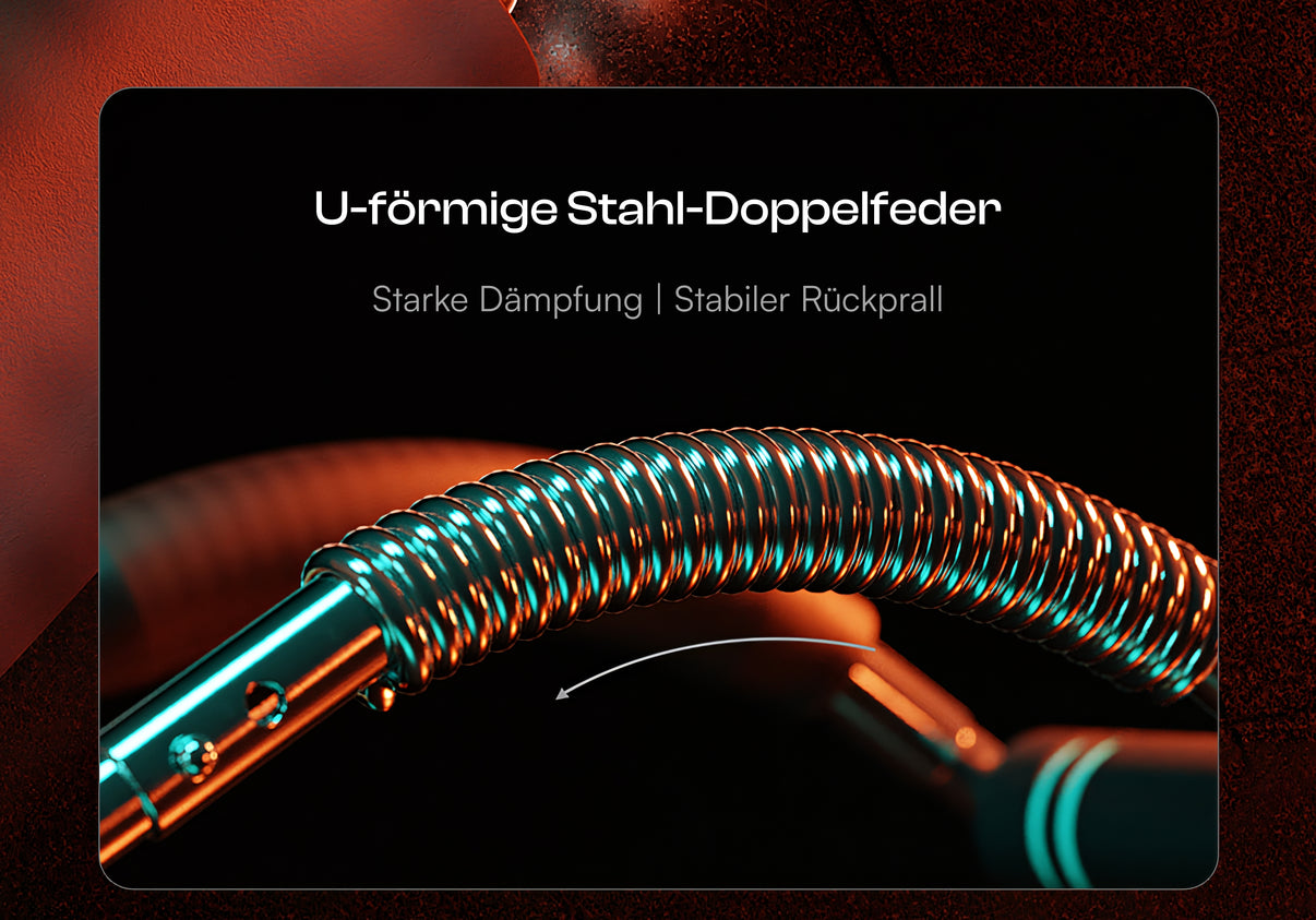 A: Sicherheit steht bei uns an erster Stelle. Die U-förmige Doppelfeder ist so konstruiert, dass sie einen sehr stabilen und gedämpften Rückprall hat. Sie schlägt nicht unkontrolliert zurück, sondern gibt den Widerstand sanft und gleichmäßig frei. Das schont deine Gelenke und gibt dir jederzeit die volle Kontrolle.