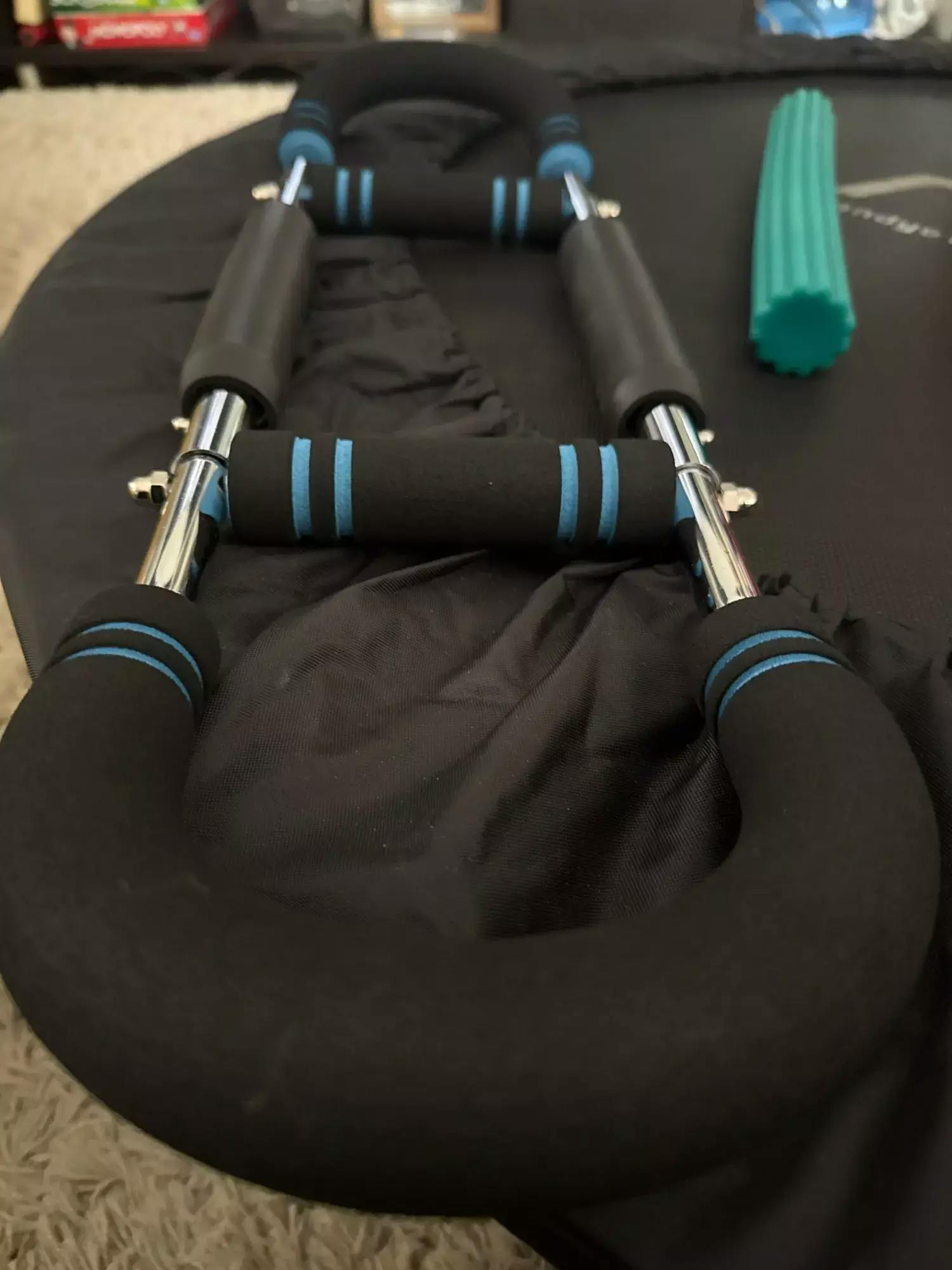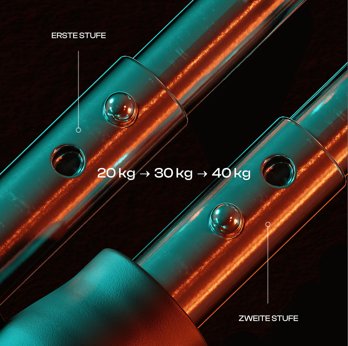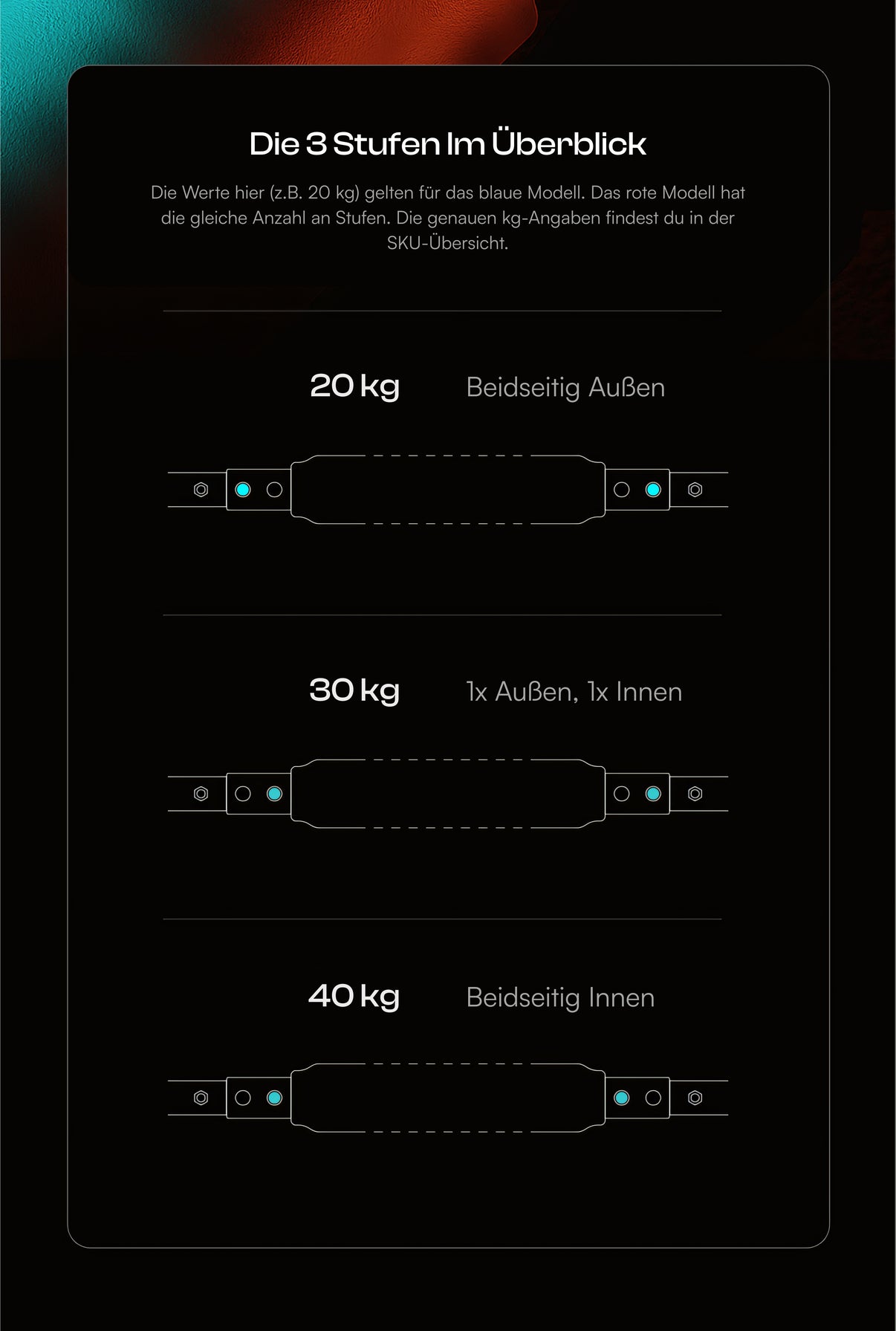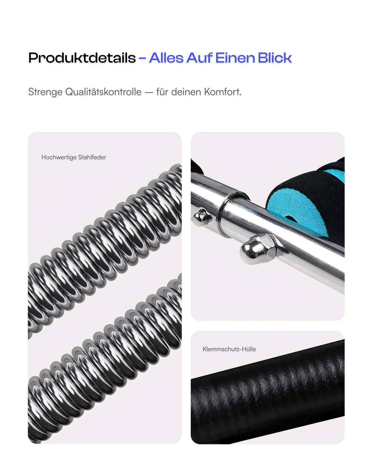 A: Das ist super einfach und clever gelöst. An den Griffen findest du einen robusten Verstellmechanismus. Durch Verschieben der Griffe kannst du die Feder verkürzen oder verlängern und so ganz einfach zwischen den drei Stufen – 30kg, 40kg und 50kg – wechseln. Das Ganze dauert nur Sekunden und rastet sicher ein.